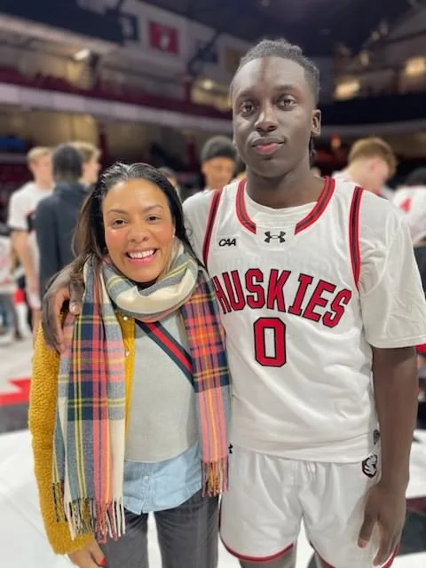 Mindy Wright, Founder & Executive Director, with Nate at one of his last basketball games at Northeastern as a senior.